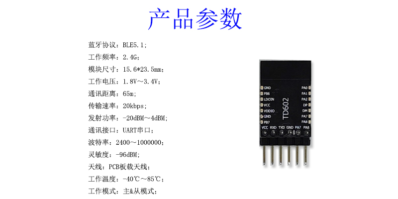 TD602藍牙模塊是拓達近期推出的一款藍牙數傳方案產品,支持藍牙BLE&SPP的純數傳芯片,可支持串口修改藍牙名、UUID、MAC地址,以及直接操作藍牙芯片自身的IO與PWM口,還包括支持簡單明了的透傳和串口AT控制功能。模塊的具體參數如下: